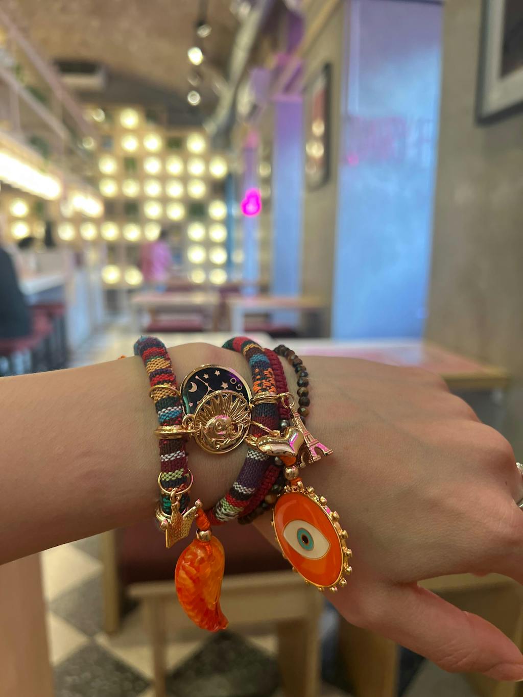 Mehrfarbiges Bohemian-Armband mit orangefarbenem bösen Blick, orange-gelbem Flügel, 11:11 und Glücksbringern